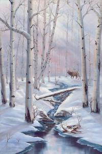 Majestic bull elk slipping through the winter aspen trees with a fresh blanket of snow and frozen creek.